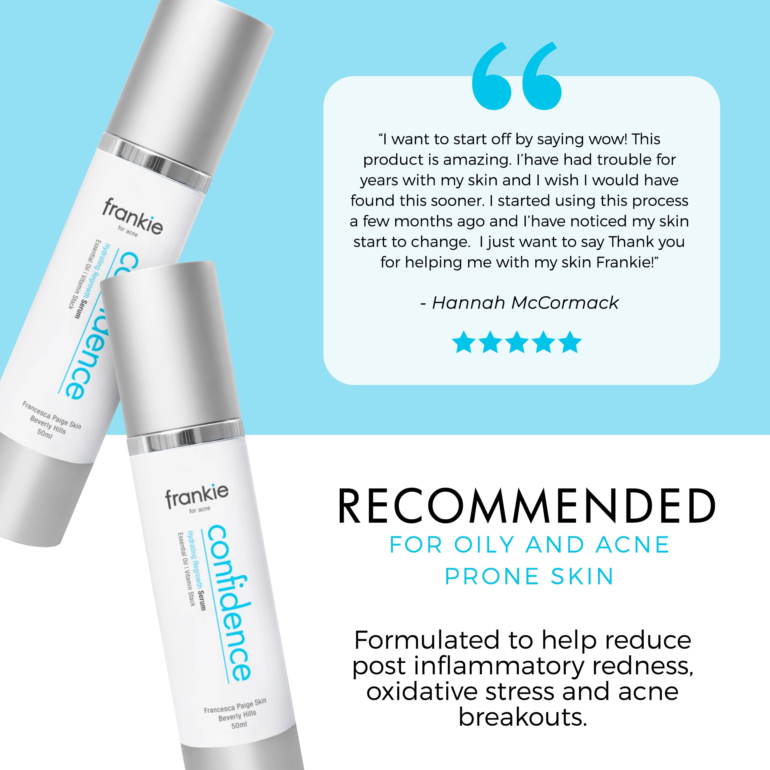 Confidence works to soothe and calm acne-prone skin with Niacinamide, Calendula and Allantoin. This cream serum is lightweight, hydrating and formulated to help reduce post inflammatory redness, oxidative stress in the skin and to reduce the severity of acne breakouts. Fast absorbing and non comedogenic.