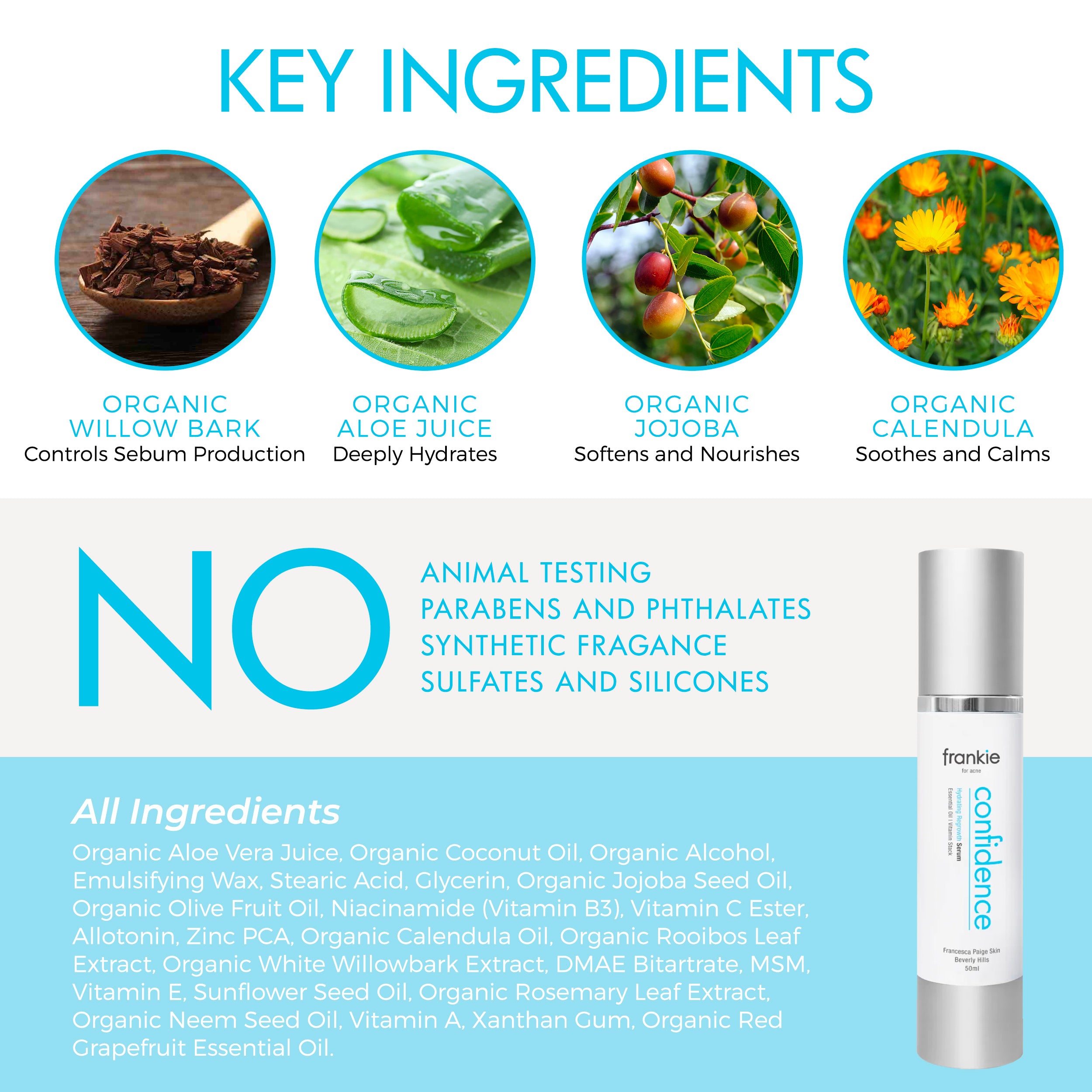 Organic Aloe Vera Juice, Organic Coconut Oil, Organic Alcohol, Emulsifying Wax, Stearic Acid, Glycerin, Organic Jojoba Seed Oil, Organic Olive Fruit Oil, Niacinamide (Vitamin B3), Vitamin C Ester, Allotonin, Zinc PCA, Organic Calendula Oil, Organic Rooibos Leaf Extract, Organic White Willowbark Extract, DMAE Bitartrate, MSM, Vitamin E, Sunflower Seed Oil, Organic Rosemary Leaf Extract, Organic Neem Seed Oil, Vitamin A, Xanthan Gum, Organic Red Grapefruit Essential Oil.