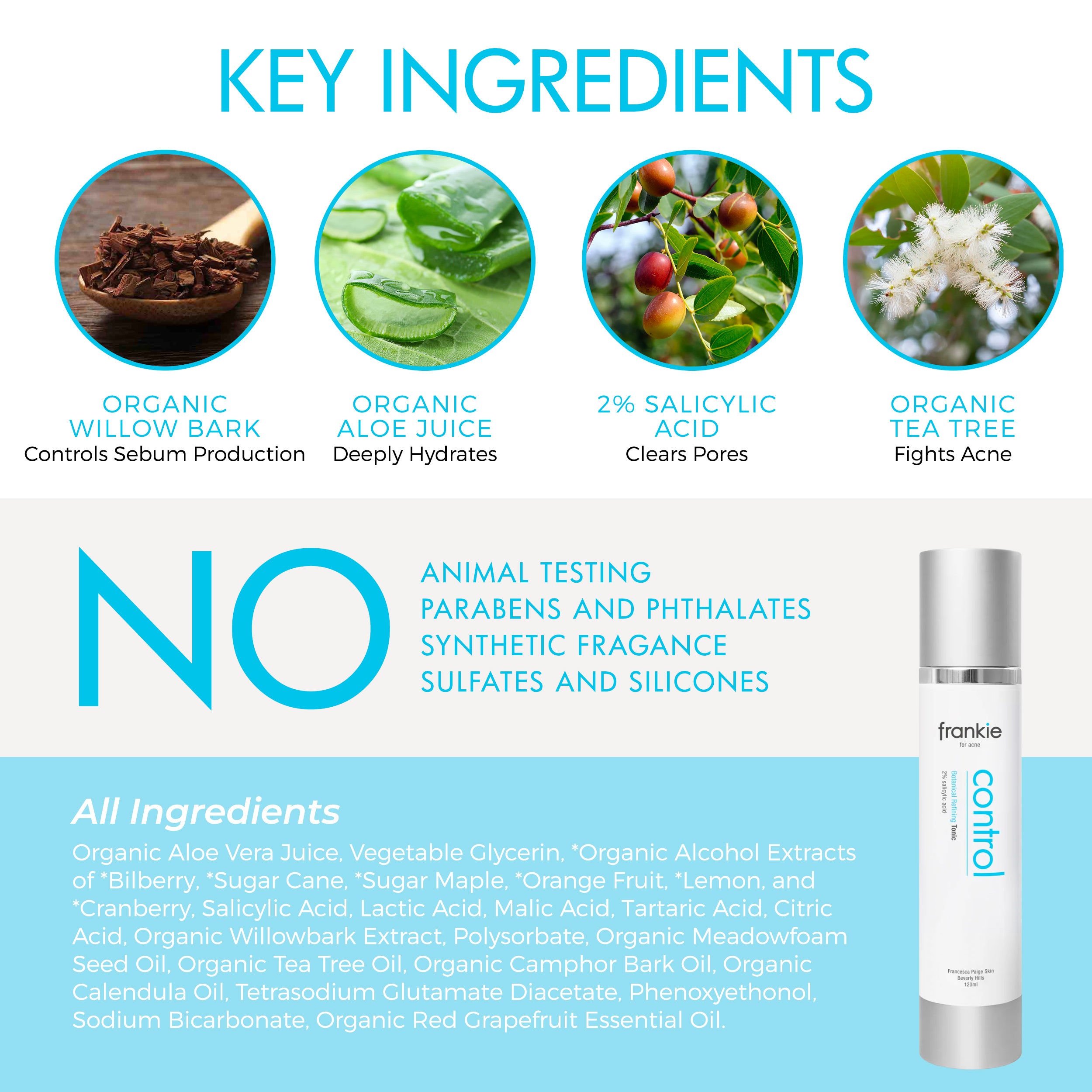 Organic Aloe Vera Juice, Vegetable Glycerin, *Organic Alcohol Extracts of *Bilberry, *Sugar Cane, *Sugar Maple, *Orange Fruit, *Lemon, and *Cranberry, Salicylic Acid, Lactic Acid, Malic Acid, Tartaric Acid, Citric Acid, Organic Willowbark Extract, Polysorbate, Organic Meadowfoam Seed Oil, Organic Tea Tree Oil, Organic Camphor Bark Oil, Organic Calendula Oil, Tetrasodium Glutamate Diacetate, Phenoxyethonol, Sodium Bicarbonate, Organic Red Grapefruit Essential Oil.